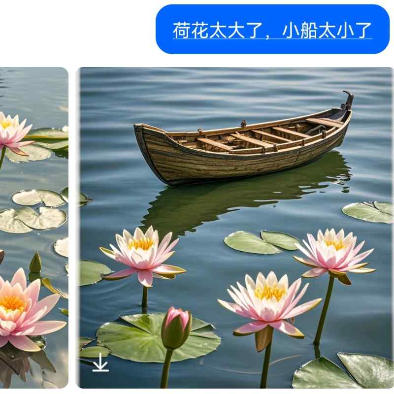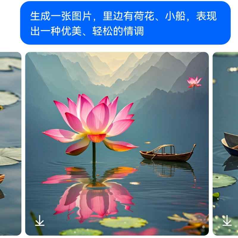 1、豆包可以智能生成圖片,并且可以根據(jù)輸入調(diào)整圖片中內(nèi)容的元素內(nèi)容以及調(diào)整元素的大小等。下圖是要求“生成一張圖片,里邊有荷花、小船,表現(xiàn)出一種優(yōu)美、輕松的情調(diào)”。