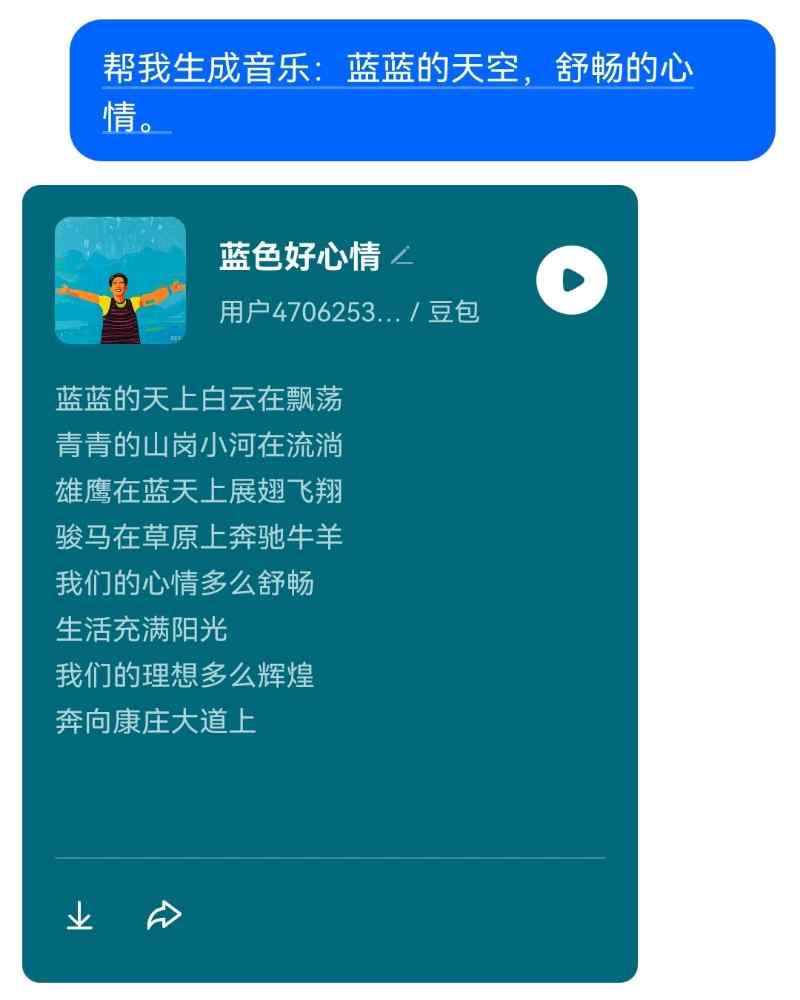 2、豆包智能體官方應(yīng)用可以自動(dòng)生成音樂(lè)。下面圖片輸入“幫我生成音樂(lè):藍(lán)藍(lán)的天空,舒暢的心情”,豆包自動(dòng)生成《藍(lán)色好心情》,包括歌詞、曲調(diào)、演唱。另外,生成音樂(lè)還可以選擇不同的模板,快速生成不同風(fēng)格的音樂(lè)。