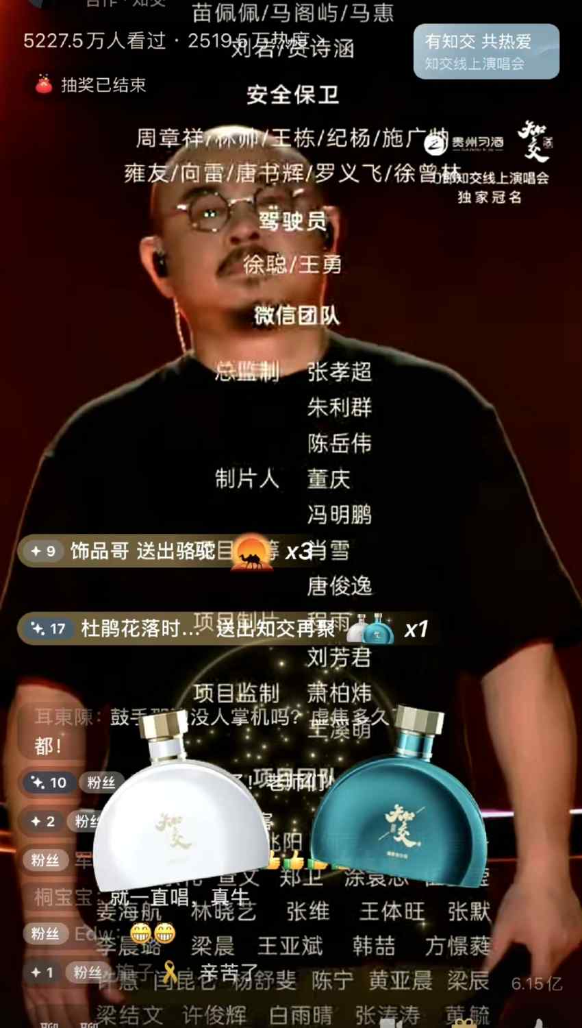 刀郎“山歌響起的地方”,刀郎知交線上演唱會,在線觀看人數(shù)5200多萬人次,熱度2500萬,點贊6.16億次。