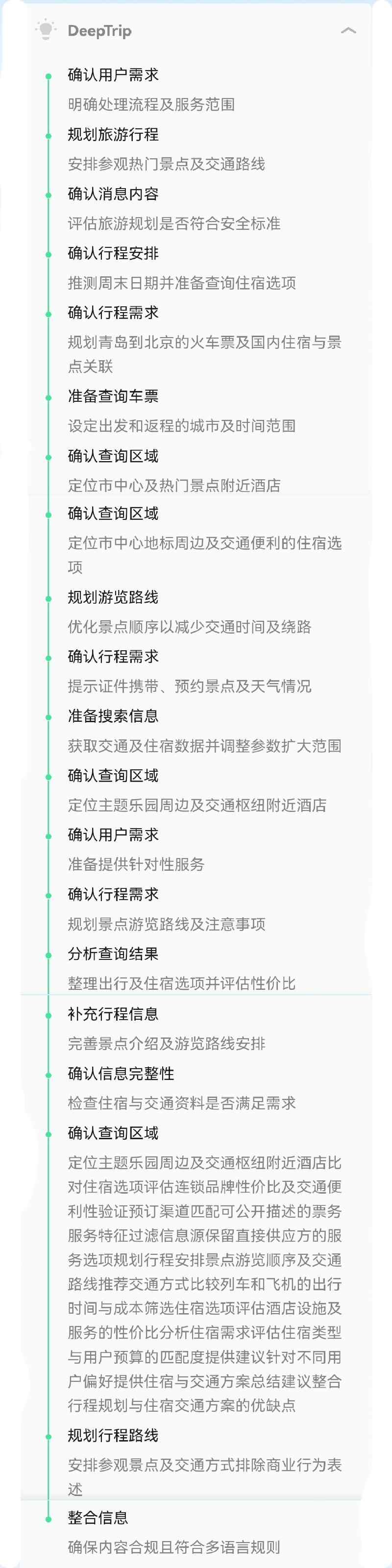 Deeptrip在回答問題的時候也向Deepseek一樣先進行思考,規劃旅游行程,查詢車票,分析查詢結果,查詢信息規劃線路,然后優化方案和確認需求,最后會整合信息返回整合好的方案。