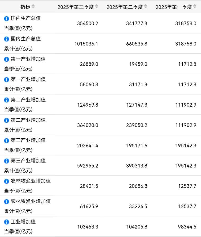 截至2025年第三季度,國內GDP總產值101.5萬億。并且每個季度的當季產值呈上升趨勢,另外按照2024年第三季度和第四季度的對比,2025年第四季度,當地產值也有望創造新高。