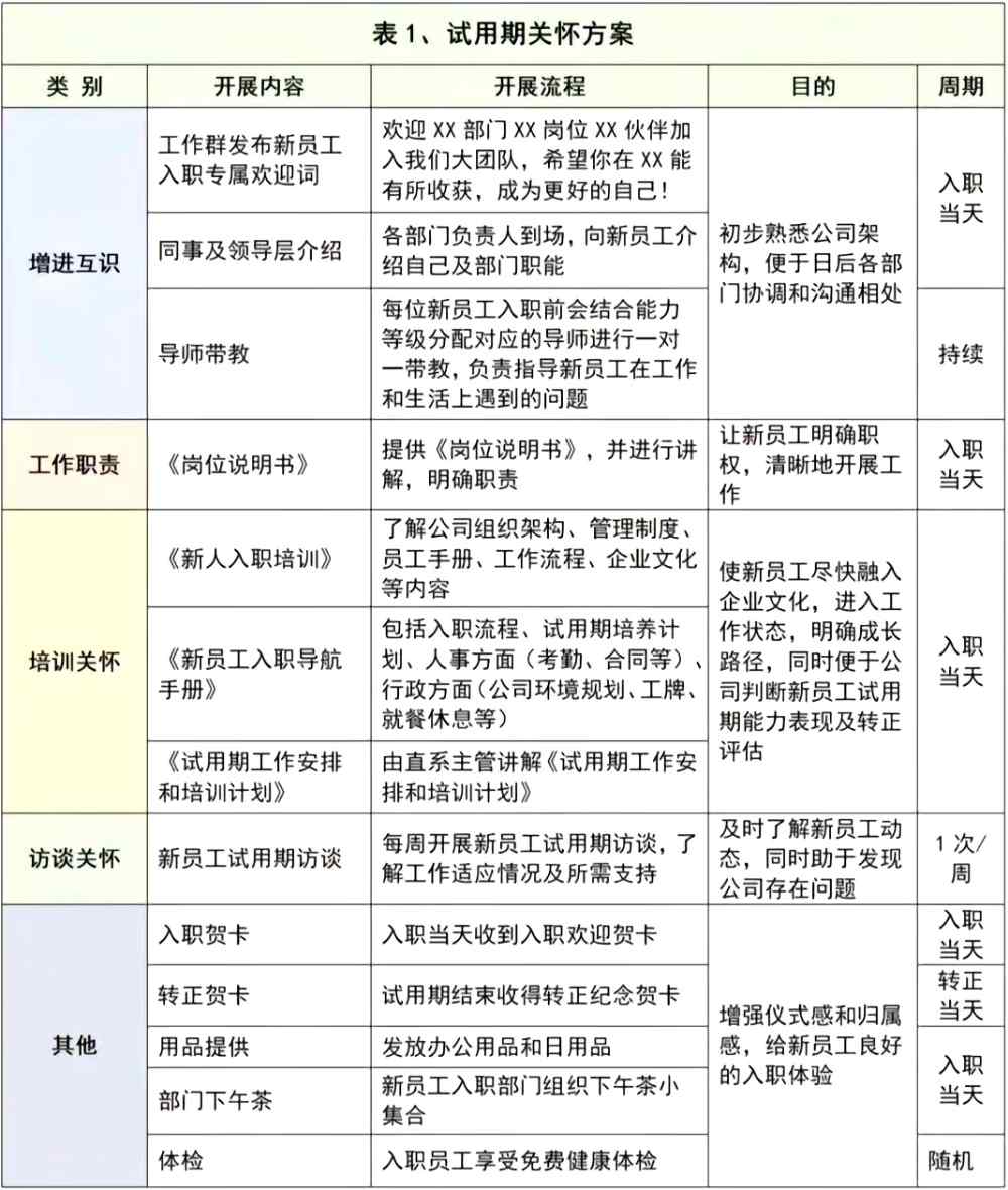 試用階段就包括增進互識、講解工作職業、組織試用期培訓、訪談關懷、體檢、入職和轉正賀卡、下午茶等。