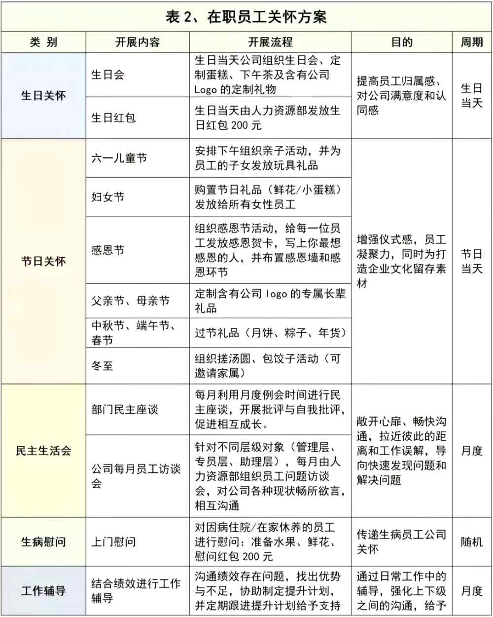 在職員工的關懷方案包括生日關懷,節日關懷、民主生活會、生病慰問、工作輔導、下午茶、各類福利、培訓進修、健康體檢、探親假等假期、優秀員工評選等。