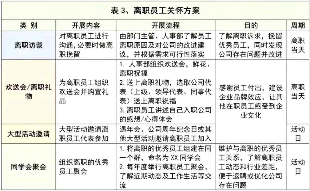 離職員工關懷方案包括離職訪談、歡送會、離職員工活動邀請、離職員工聚會等。