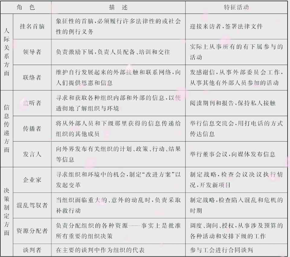 1. 人際角色類:掛名首腦、領導者、聯絡者。