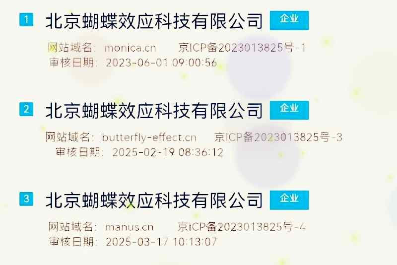 通過查詢還發現蝴蝶效應公司當前備案號“京ICP備2023013825號”下有三個網站,分別是monica.cn,butterfly-effect.cn,manus.cn,三個域名備案名稱均為“北京蝴蝶效應科技有限公司”,蝴蝶效應公司對.cn域名比較認可。