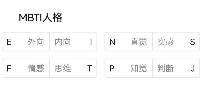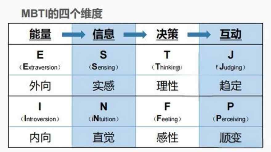 MBTI共有16種人格,這16種人格由4個維度構成,分別為內向與外向、直覺與實感、情感與思維、知覺與判斷,每一個維度有兩個字母,并且四個維度有先后順序分別為:E或I、N或S、F或T、P或J。