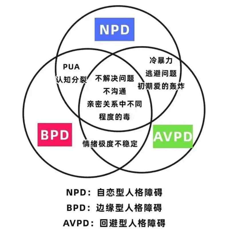 除了NPD,還有類似的兩種BPD、AVPD。這三種“人格”共同的特點是不快速解決問題、溝通障礙、相處中存在嫉妒等。NPD和BPD的人都容易PUA他人。