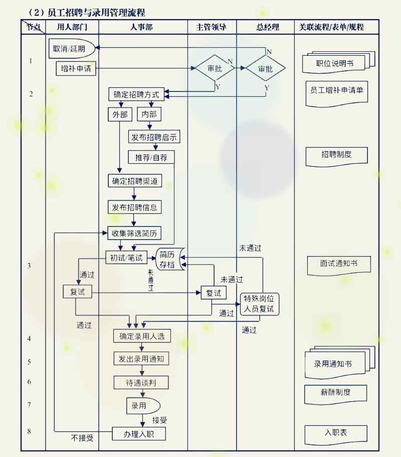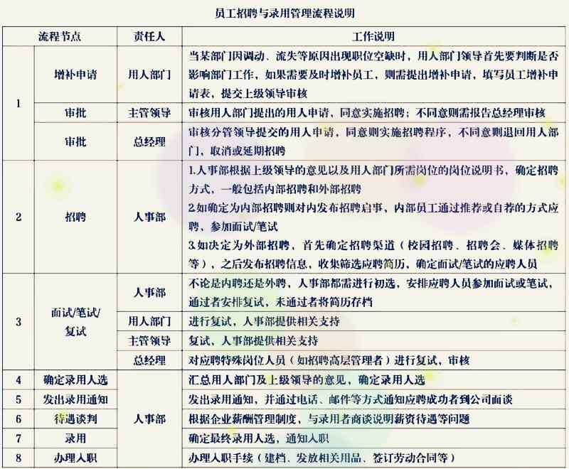 員工招聘和錄用管理流程包括:通常包括編制/增補申請,確定招聘方式/渠道,發布招聘通知,收集簡歷,面試/筆試/復試,錄用管理(確定人選、錄用通知、待遇談判、錄用審批、辦理入職)。