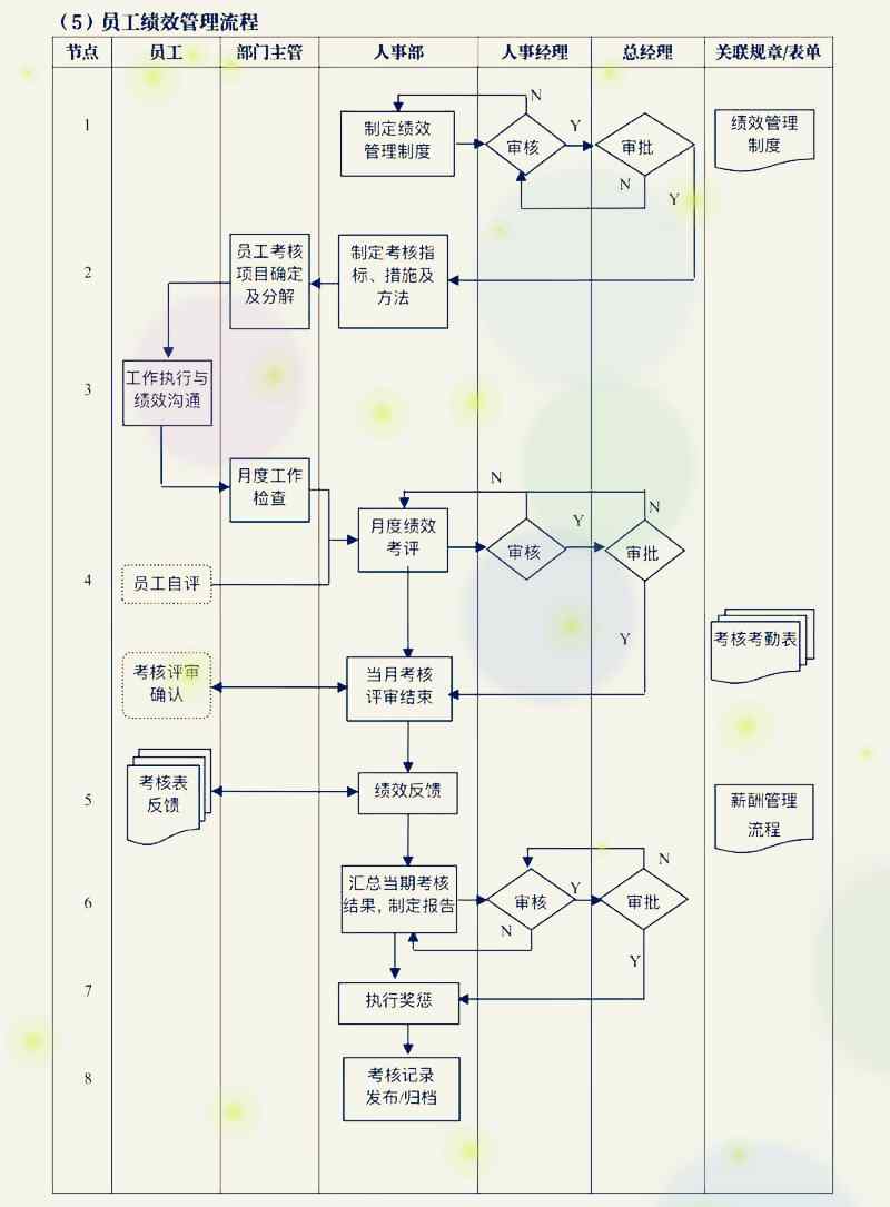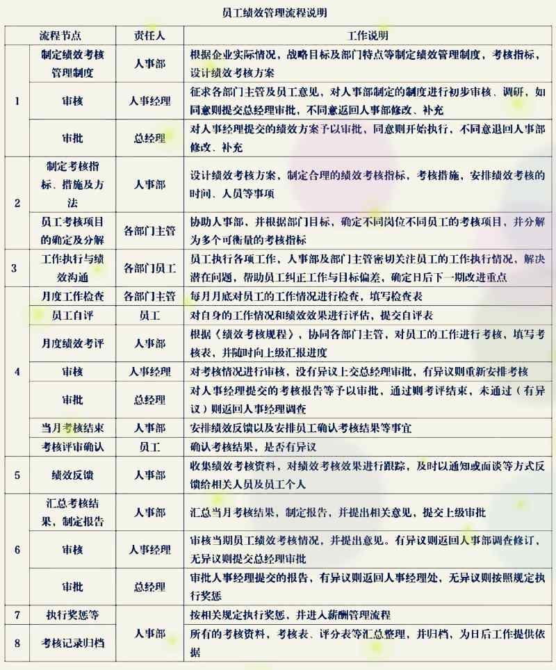 員工績效管理流程包括:績效考核制度的制定、審核、審批,制定考核指標、措施、方法,員工看個項目的確定與分解,工作執行與績效溝通,月度員工工作檢查、溝通、評價、審核、審批,績效反饋,總體的評價結果的評價、審核、審批,績效獎懲,績效結果歸檔。