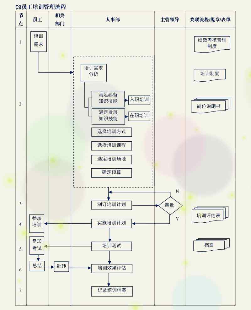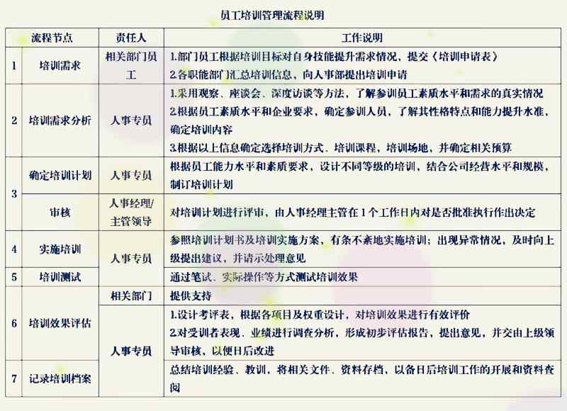 員工培訓管理流程包括:培訓需求管理,培訓需求分析,確定培訓計劃,培訓計劃審核,培訓實施,培訓測試,培訓效果評估,以及記錄培訓記錄的檔案。
