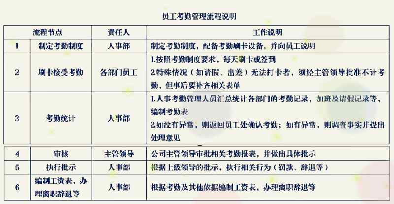 員工考勤管理流程包括:確定考勤管理制度,確定排班規則,員工刷卡,收集考勤數據,考勤數據統計,審核和批準考勤報表,編制工資表等。