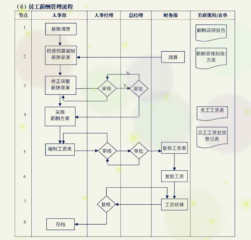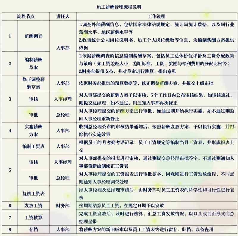 員工薪酬管理流程包括:薪酬調查,編制薪酬草案,修正和調整薪酬方案、審核、審批,實施薪酬方案,編制工資表并審核、審批、復核,核算與工資發放,工資發放記錄存檔。