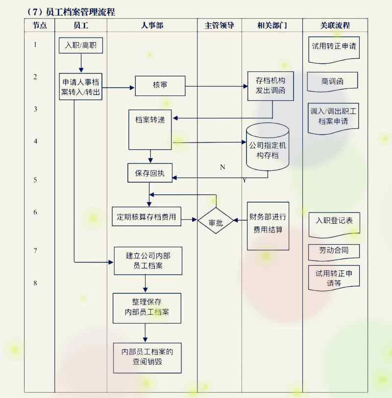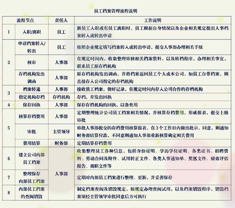員工檔案管理流程包括:入職/離職觸發,申請檔案轉入/轉出、審核,存放機構發出調檔函,檔案轉遞,指定機構存檔與回執,存檔費用核算、審批、結算,公司內部檔案的建立、整理、查閱、銷毀等。