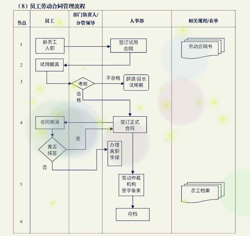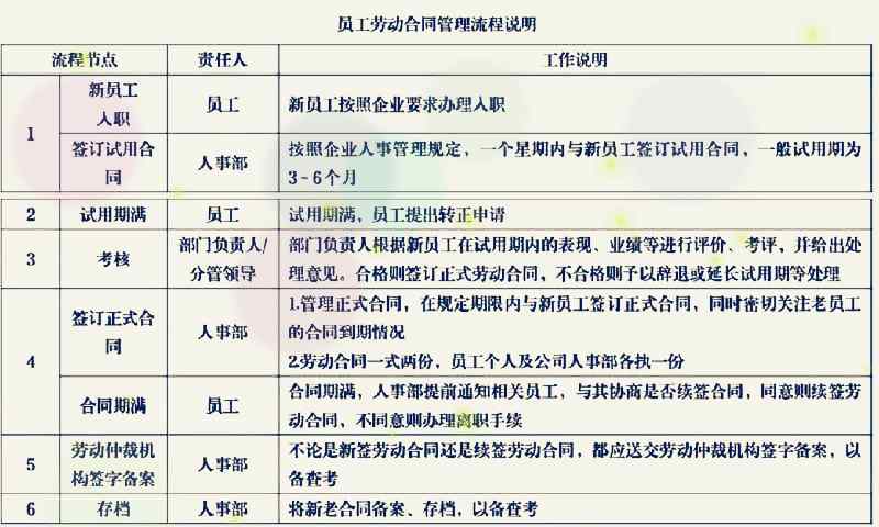 員工勞動合同管理流程包括:新員工入職,簽訂試用期合同,試用期滿且試用通過,簽訂正式合同,合同存檔;合同期滿,協商續簽合同、符合條件簽署固定器或無固定期限合同,不續簽則辦理離職,檔案存檔等。