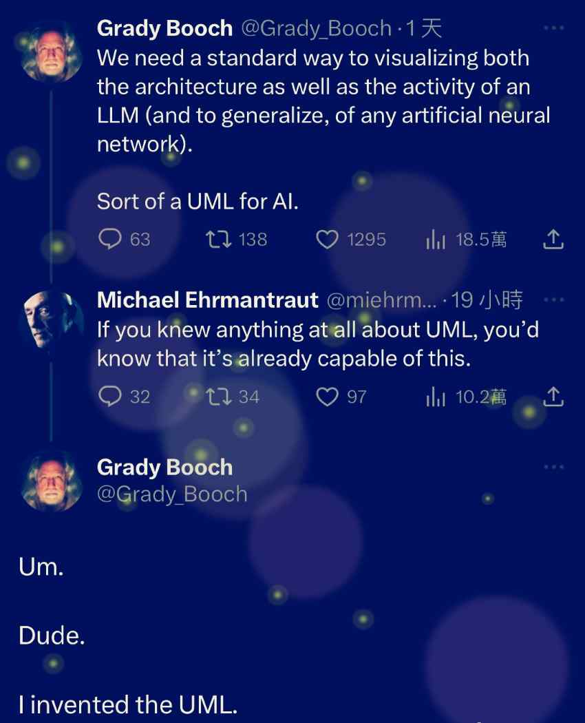 UML由Grady Booch、James Rumbaugh、Ivar Jacobson三人共同發明,下面是一個發明者Grady booch的段子。