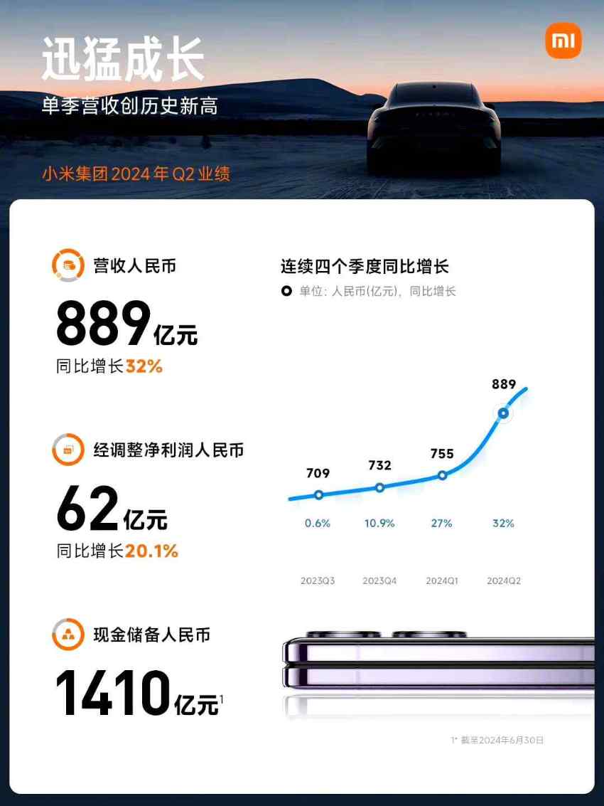 雷軍在個(gè)人賬號(hào)發(fā)布,小米第二季度財(cái)報(bào)亮眼。其中,小米季度銷(xiāo)售收入連續(xù)增長(zhǎng),2024年二季度收入889億,增長(zhǎng)32%。調(diào)整后凈利潤(rùn) 62億,增長(zhǎng) 20.1%;研發(fā)投入 55億,增長(zhǎng) 20.7%。