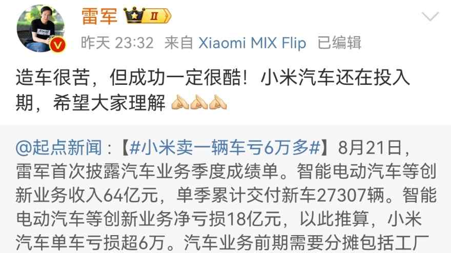 雷軍8月22日又轉(zhuǎn)發(fā)信息,解釋汽車(chē)業(yè)務(wù)為什么前期是虧損的。主要原因是汽車(chē)業(yè)務(wù)前期需要分?jǐn)偝杀?,包括前期的工廠建設(shè)、技術(shù)研發(fā)、人員成本、門(mén)店建設(shè)等費(fèi)用,前期的報(bào)告上的業(yè)務(wù)虧損屬正常情況。