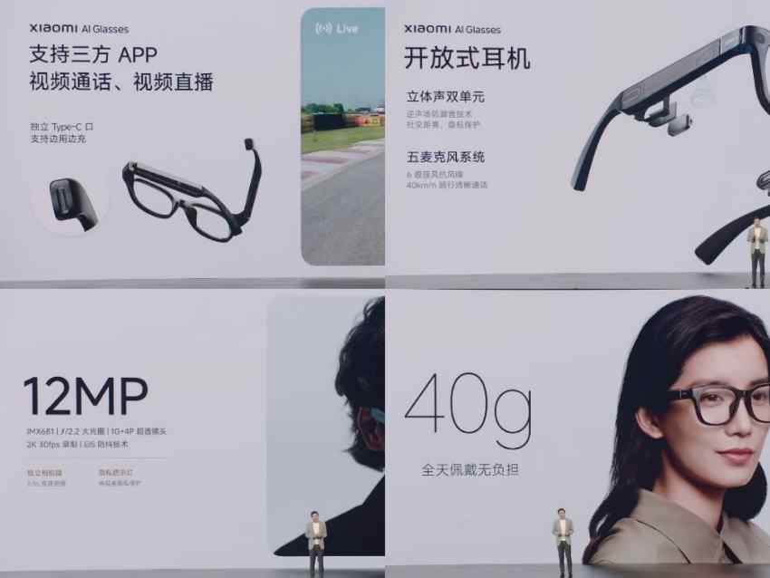 作為一款隨身的設備,小米眼鏡支持第三方APP視頻通話和直播,配置開放式高音效的耳機。另外,眼睛只有40克,佩戴輕盈。