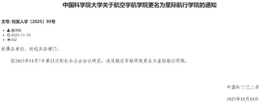 國科大官方確認!航空宇航學院正式更名為星際航行學院,11月7日校長辦公會審議通過,18日發(fā)內(nèi)部通知,選課系統(tǒng)已啟用新名,官網(wǎng)后續(xù)完成“流程”后更新。