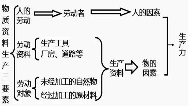 生產力三要素又可以概括的分為人的因素和物質的因素。人的因素是指人的勞動,也就是勞動者。物質的因素包括勞動資料和勞動對象。