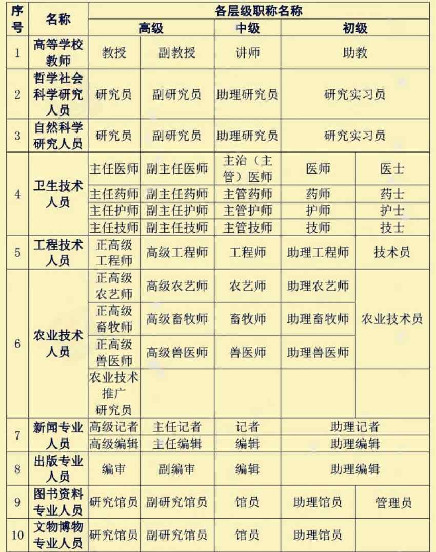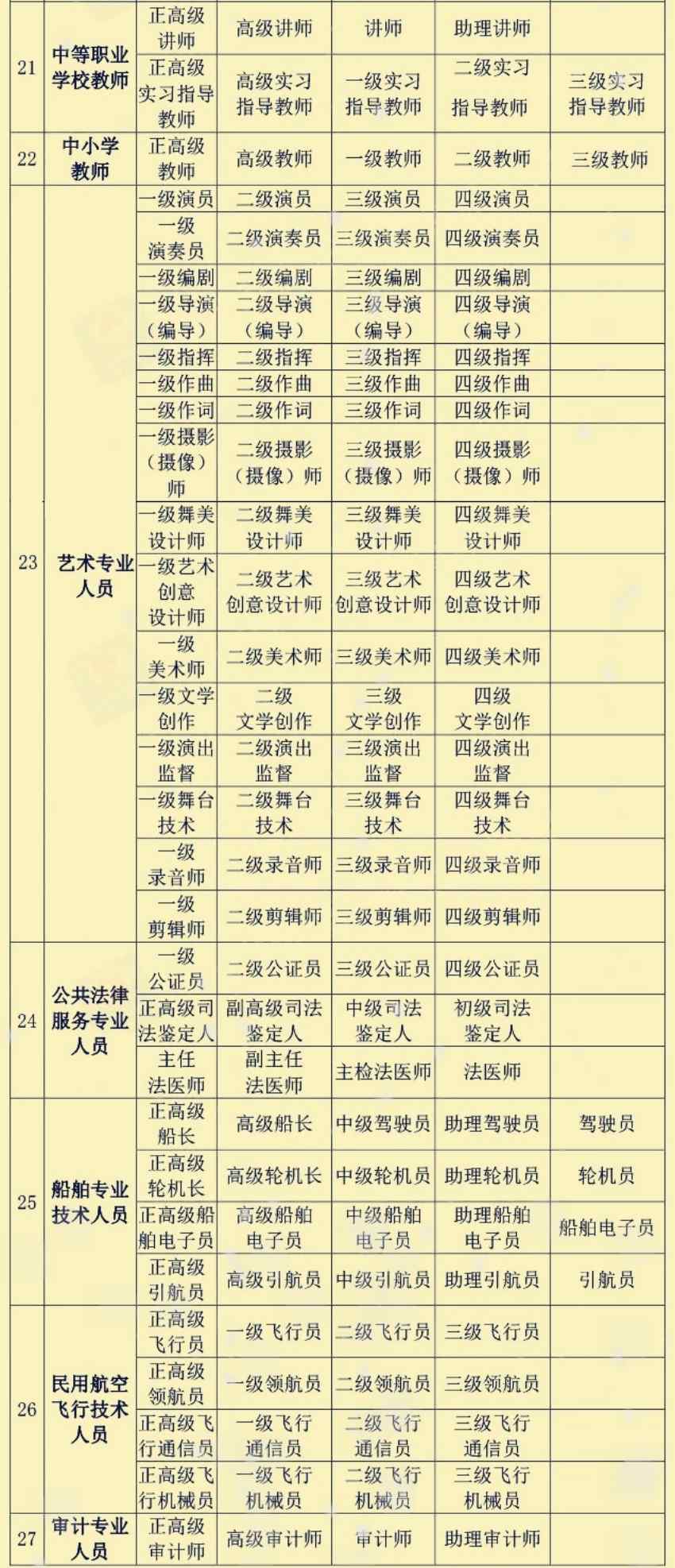 27個(gè)職稱系列或?qū)I(yè)及層級(jí)對應(yīng)如下:
